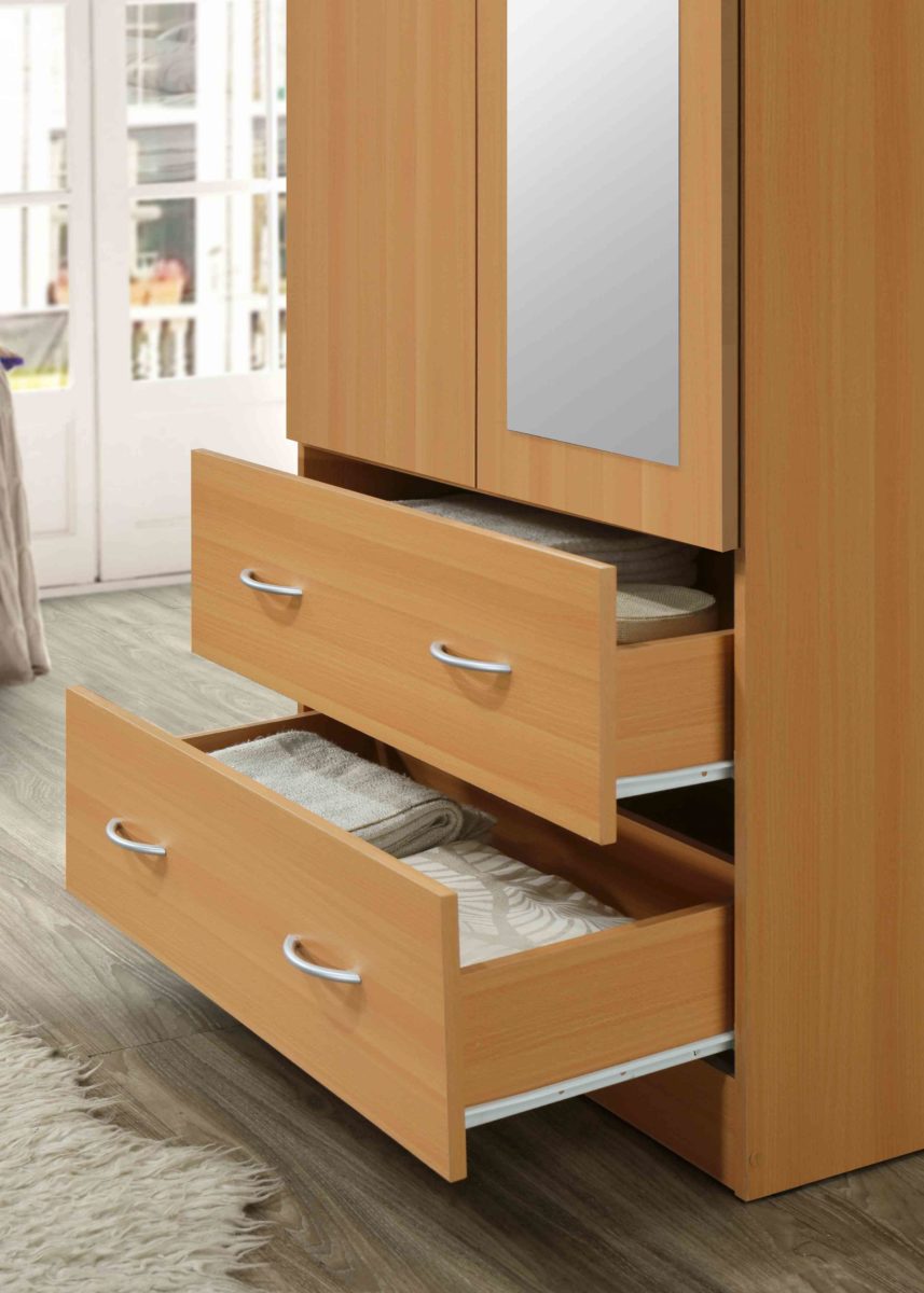 The Hodedah 2-Door Armoire is the perfect stand alone piece of furniture to organize your entire wardrobe. Featuring two doors that easily open to reveal a clothing rod that is best suited to hang your wrinkle prone pieces. The base of this upper compartment serves as a shelf, here you can store folded jeans and t-shirt. The bottom of the closet has two drawers reinforced with metal runners and safety stops that will keep the drawer firmly in place when it is fully opened. Store anything from clothes to linen in these spacious drawers. After picking out our outfit of the day close the doors of this wardrobe to view your style in this almost full body length mirror. We have laminated this piece in a variety of finishes, you can be sure to find the perfect color to blend with your room decor.
