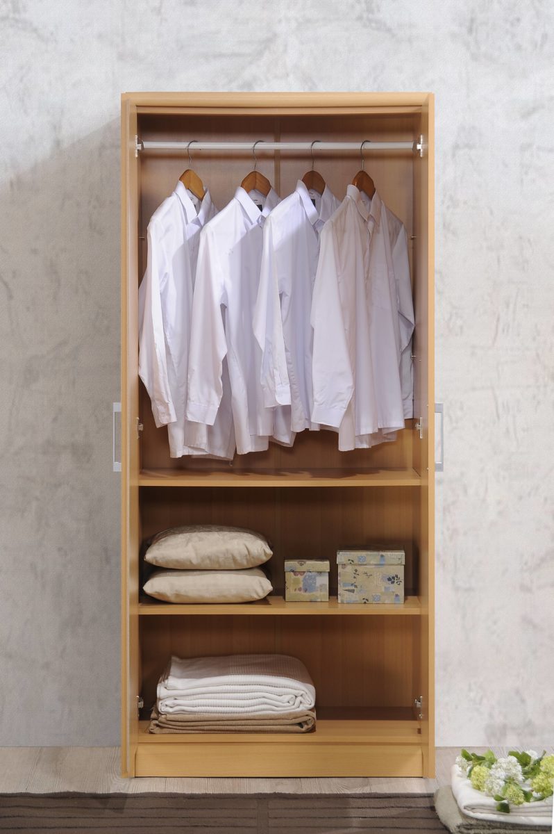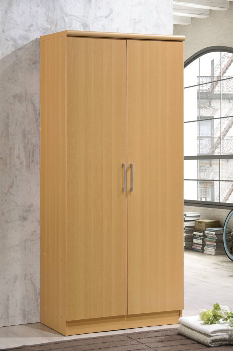 The Hodedah 2-Door Armoire is the answer to all your storage needs. Constructed of sturdy, durable engineered wood in a variety of laminated finishes, you are sure to find the perfect match to blend seamlessly with your home decor. Featuring two doors that easily open to four spacious shelves that can be used to store clothing, linen, books, shoes, the options are endless. The inclusive garment rod allows you to neatly hang your clothes up if you prefer. You can place this armoire in your Bedroom, Guest room, Kids’ room, Garage, Home Office or anywhere that you need storage. Ideal for bedrooms with contemporary and transitional decors. The silver-tone handles complete the piece with polish and add accessibility. It is easy to care for and can be wiped clean with a dusting cloth.