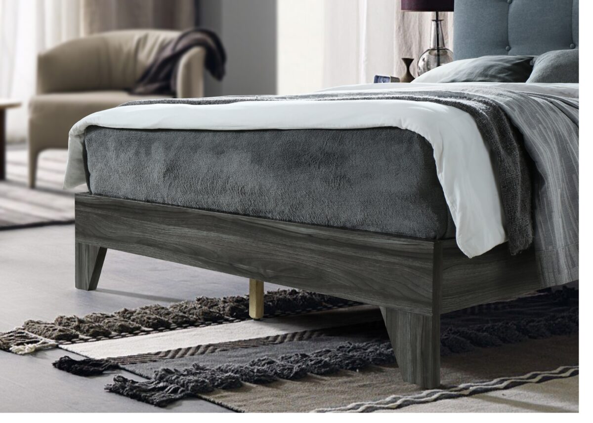 Hodedah Grey Upholstered Platform Bed with Headboard and Wooden Frame